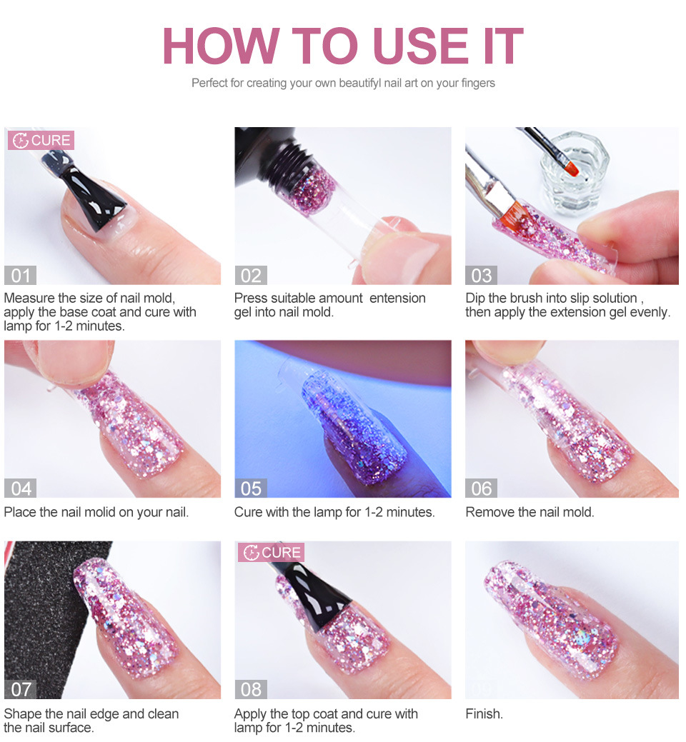 6.Put the nail form with poly nail gel to your nail. Cured by UV/LED lamp.